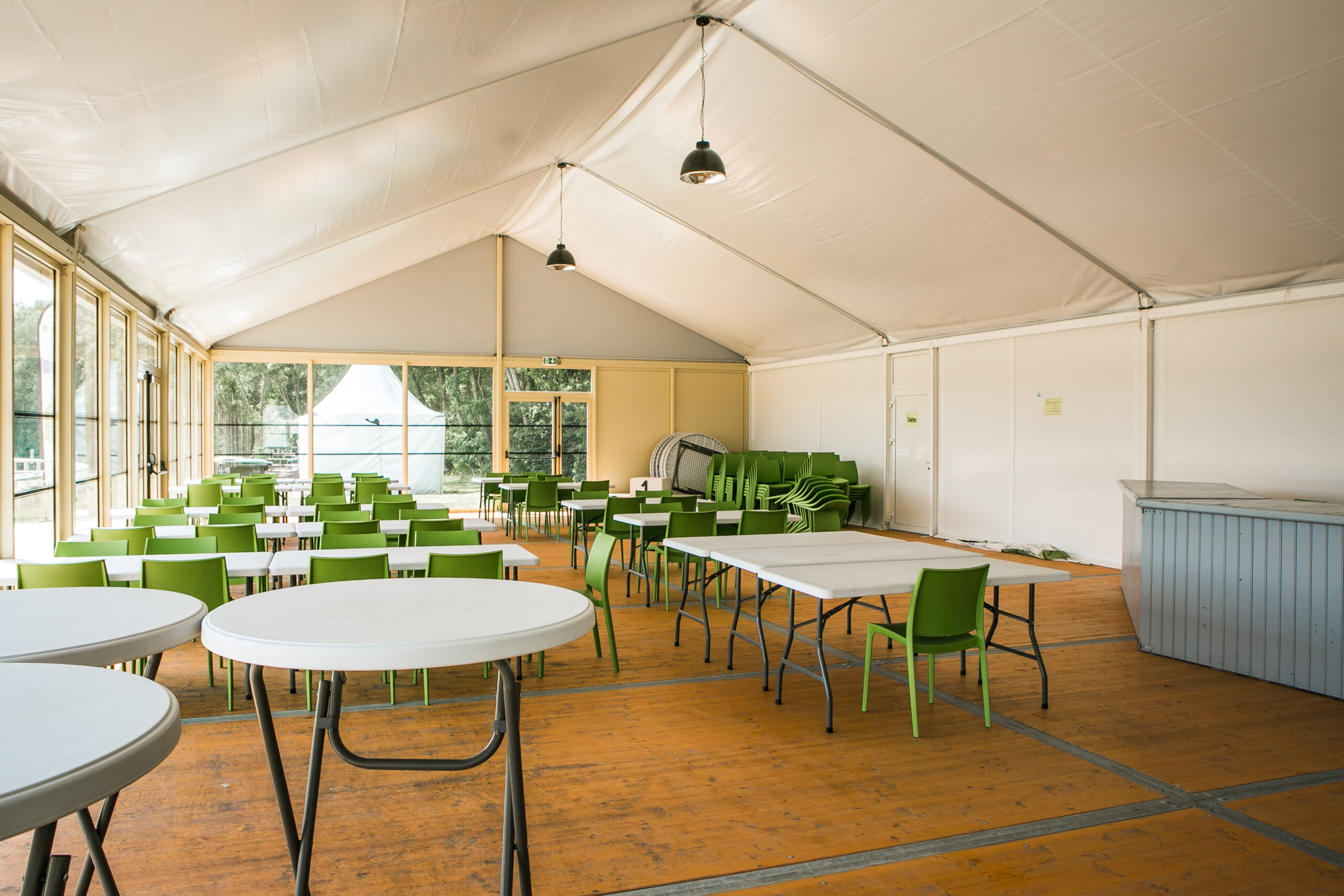 Mobilier : 6 tables hautes, 23 chaises hautes, 9 tables rondes (8 pers.), 20 tables rectangulaires (6–8 pers.), 170 chaises